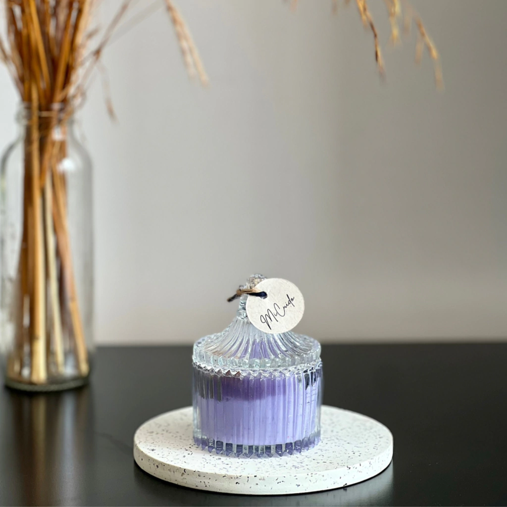 Nossa vela é entregue em uma bomboniere de vidro com tampa, podendo ser reutilizada. Temos o REFIL da vela.